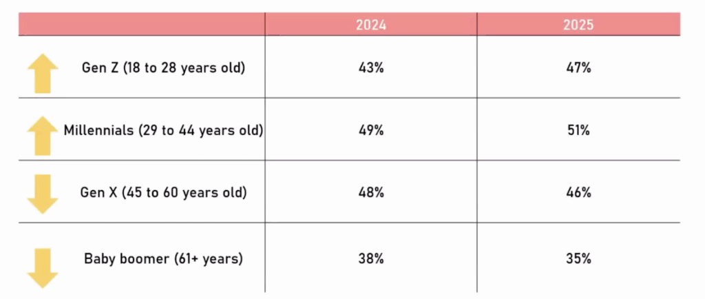 • Gen X: Biggest spenders. Prioritize quality, reliability, and loyalty-building programs.