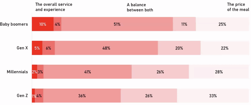 Dining frequency is lowest among Boomers (35% weekly), but they represent a deeply loyal base. They value tradition, comfort, and attentive service. Less tech-reliant, Boomers prefer personal interactions and straightforward hospitality.
